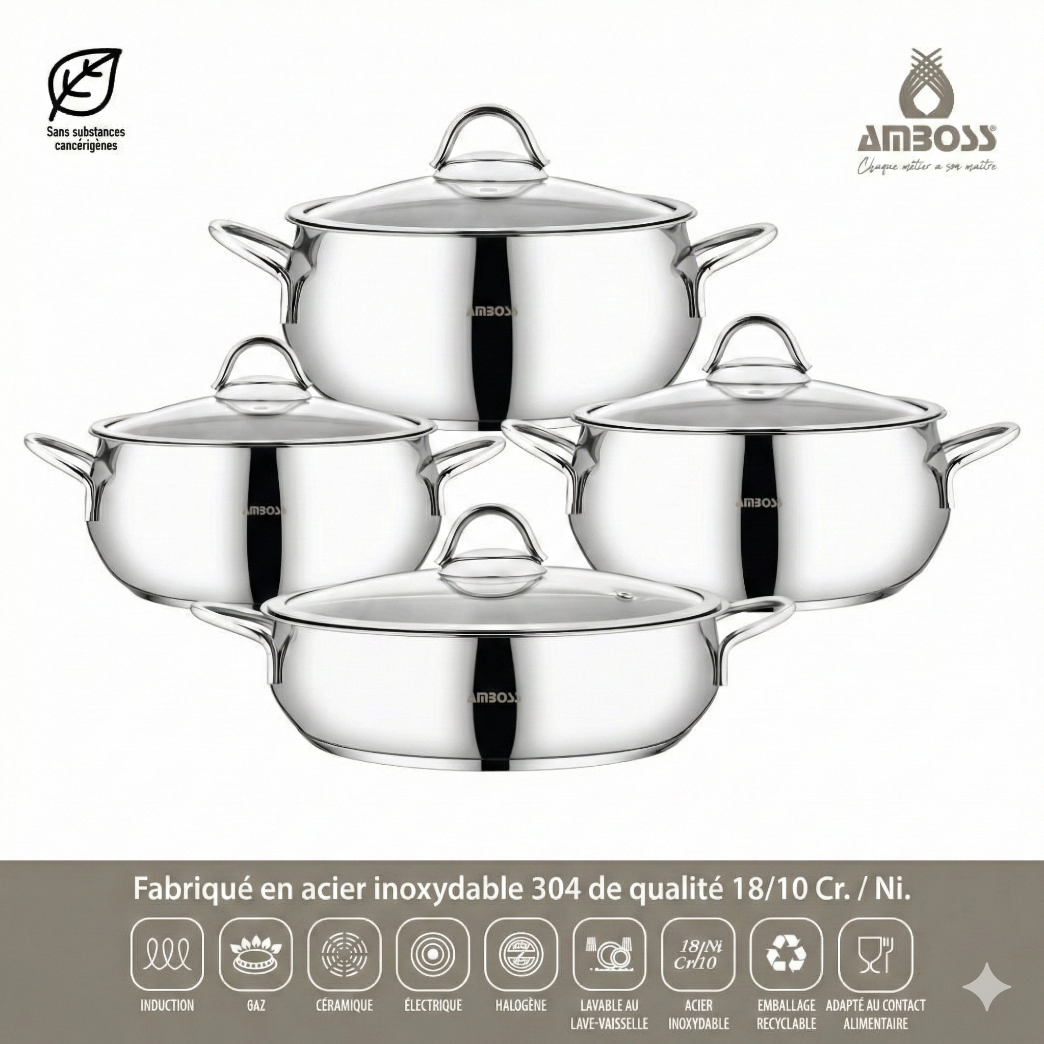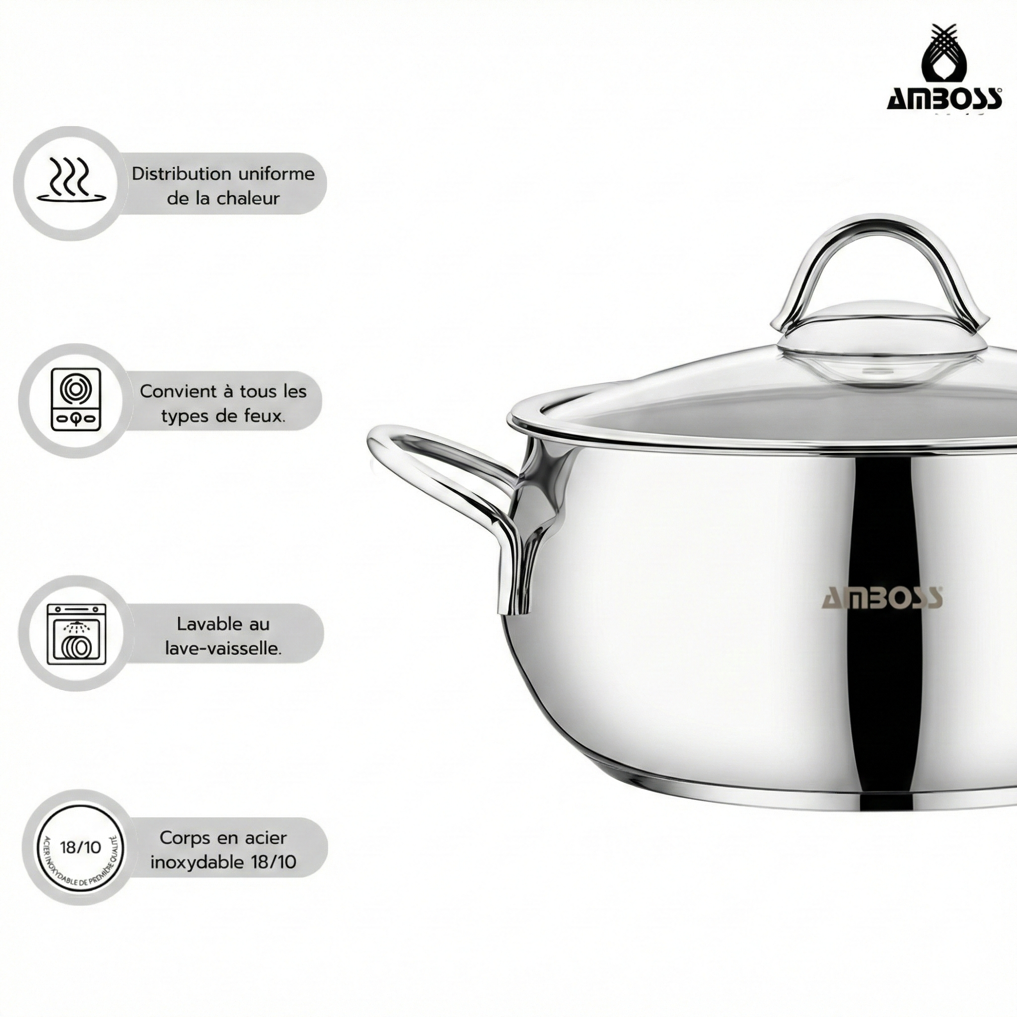 Fond encapsulé en acier : Compatible avec tous les types de plaques de cuisson (gaz, électrique, vitrocéramique et induction). Assure une diffusion rapide et homogène de la chaleur.