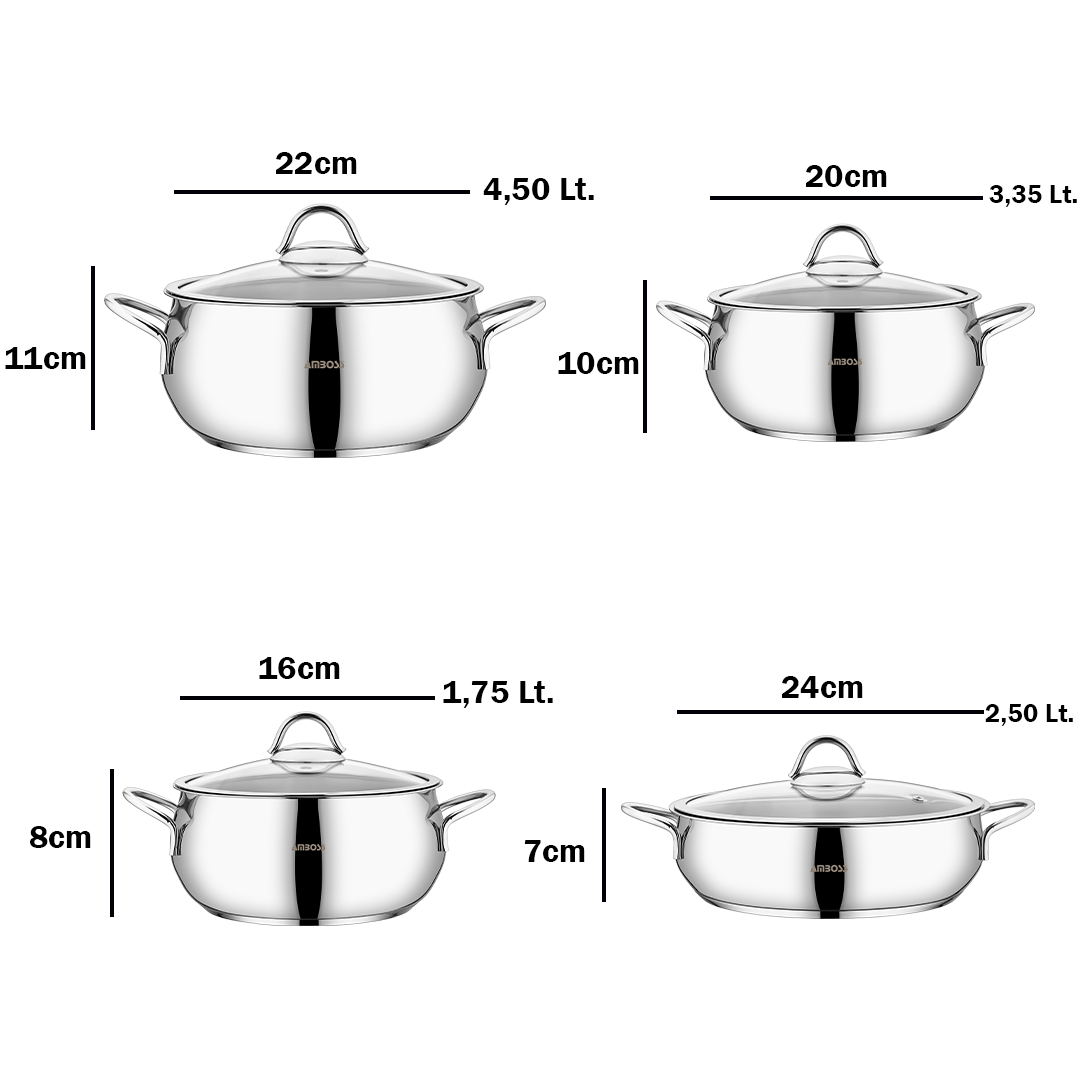 Tailles variées : Les casseroles de différentes tailles – 16 cm, 20 cm, 22 cm et 24 cm – vous permettent de cuisiner toutes sortes de plats.